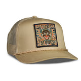 This trucker hat also has a rope?! That’s like two hats in one! The future is now. Our Stanley hat sports a nifty embroidered felt patch.