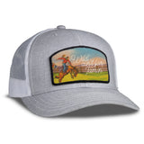 Our Trucker Style hat with a nifty embroidered felt patch. Big Rig not included.