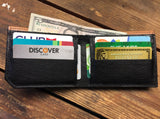 This particular wallet is equipped with with eight card pockets and a cash pocket, so you'll have plenty of room for all of your stuff. However, we still worked really hard to keep it thin enough to easily slip in to your front pocket, too!