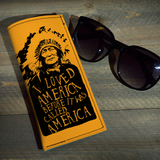 You'll never be seen as boring when carrying one of our fun, colorful eyeglass cases. They are made from full-grain leather and lined with a soft, contrasting felt to keep your glasses safe. This design is exclusively a part of our Steven Paul Judd collection. Steven is a filmmaker, writer, painter, and all around awesome guy! His works feature mix of modern pop culture and his native heritage. We hope you love the collection!
