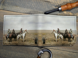 All of our wallets are handmade from scratch in Oklahoma, USA. Each piece is cut, sewn, and finished by hand, so you know you're getting a top quality product. This design is exclusively a part of our Steven Paul Judd collection. Steven is a filmmaker, writer, painter, and all around awesome guy! His works feature mix of modern pop culture and his native heritage. We hope you love the collection!